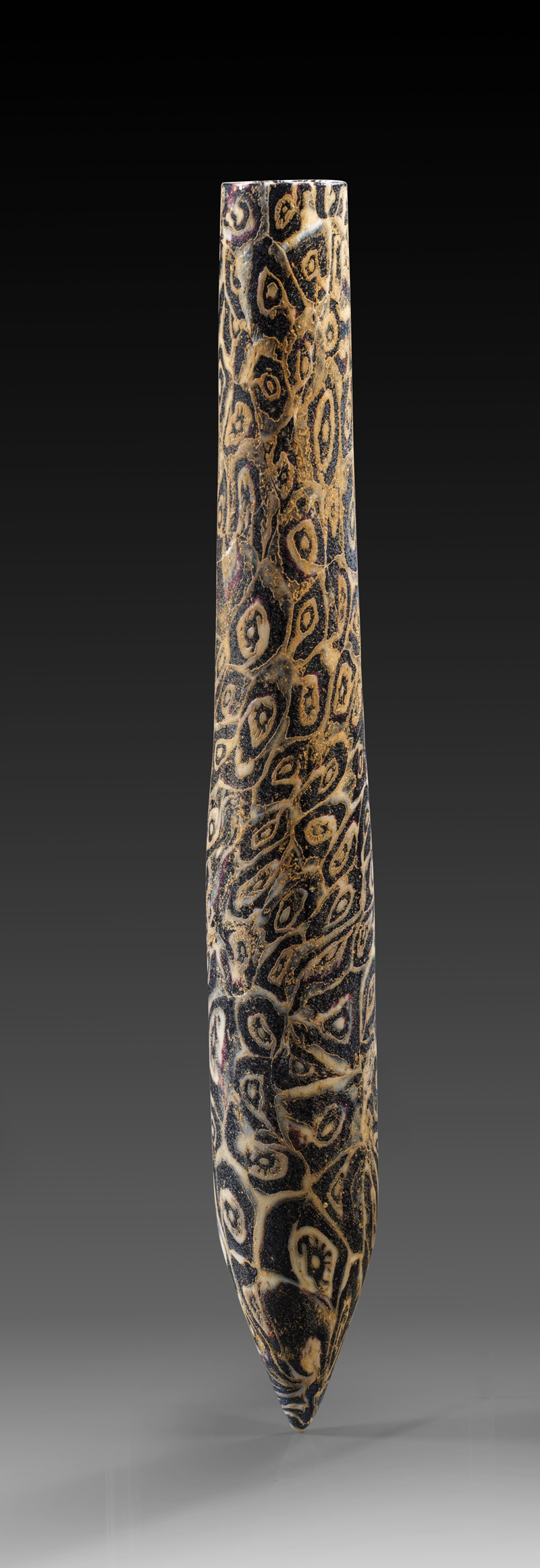 OBJEKTE AUS GLAS Spitzbodiges Alabastron. Schwarz-weißes opakes Millefioriglas. Mosaikglasscheiben mit konzentrischen Kreisen in schwarzer Masse. Späthellenistisch oder frühe Kaiserzeit, 1. Jh. v.-1. Jh. n. Chr. H. 19,4 cm. Restauriert.