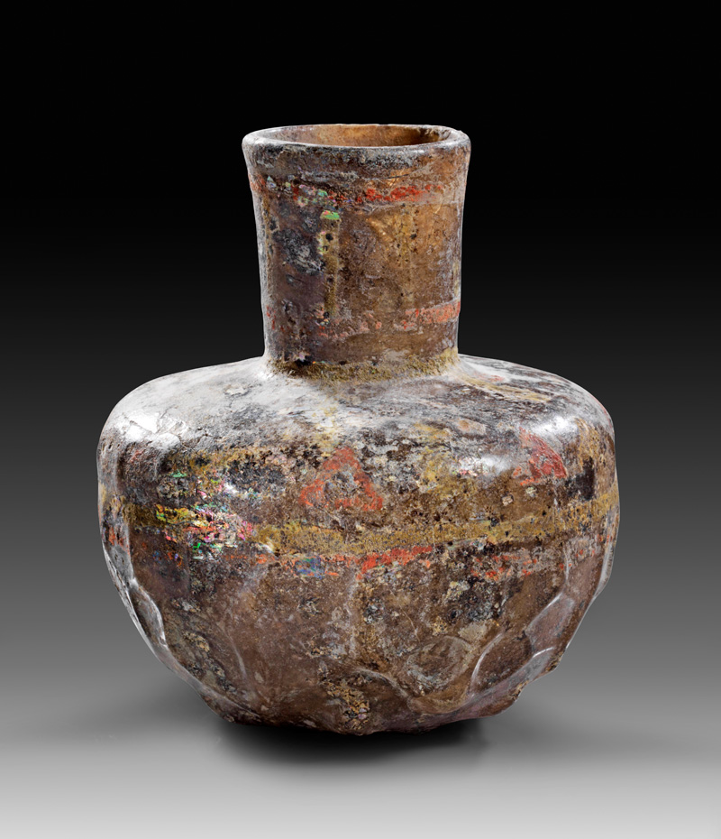 OBJEKTE AUS GLAS Kleine Flasche aus farblosem, durch Belag und Iris großteils opakem Glas mit Resten von roter Bemalung. Formgeblasen. Wabenmuster. Scharfer Schulterknick und zylindrischer Hals. Islamisch, 8.-12. Jh. H. 9,0 cm. Intakt.