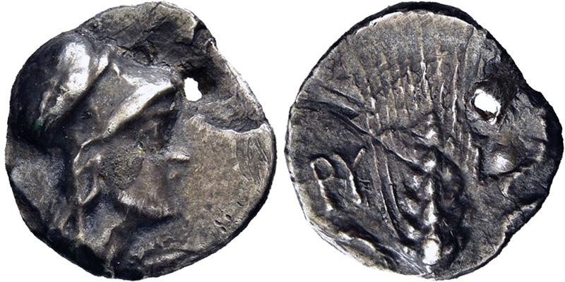 GRIECHISCHE MÜNZEN, ITALIEN, APULIEN, RUBI. Diobol. 4./3. Jh. Behelmter Athenakopf r. Rs: Ähre. Beizeichen Füllhorn. SNG COP. 669. 0.78g, Gelocht. Schöne dunkle Tönung. R ss