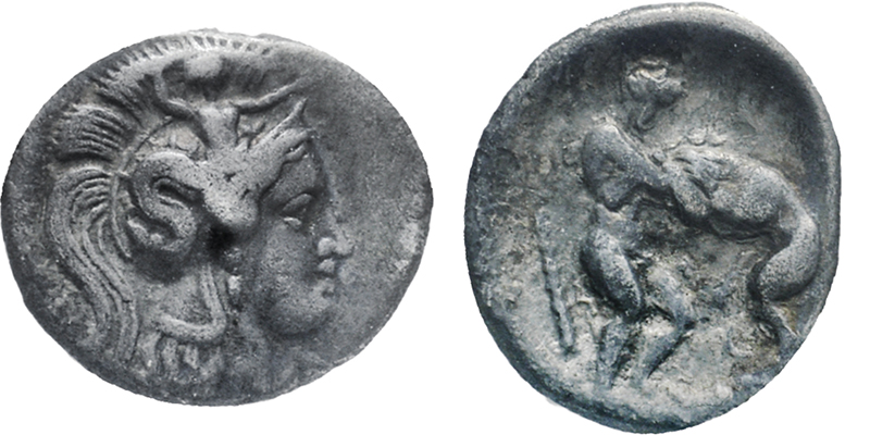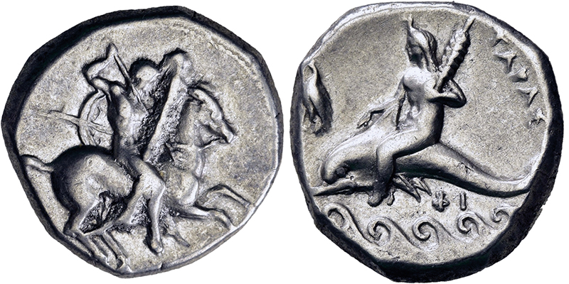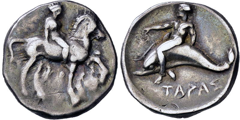Ex Künker 111, 2006, Los Nr. 6030. Der Delphinreiter kann mit beiden mythischen Gründern von Tarent identifiziert werden. Der eponyme Flußgott Taras, ein Sohn des Poseidon mit der Nymphe Satyra, war auf einem Delphin von Tainaron nach Tarent geschwommen. Der Spartaner Phalantos war der Anführer der Parthenier im 1. Messenischen Krieg und mußte nach der Niederlage die Heimat verlassen. Er wurde bei der Überfahrt nach Italien von einem Delphin vor dem Seetod gerettet. Die Münzlegende sowie die Darstellung des Hippocamps sprechen evt. eher für Taras. Wahrscheinlich sahen die Tarentiner hier aber nur ihren Oikistes (Stadtgründer) dargestellt, ohne sich für einen von beiden Mythen entscheiden zu müssen.