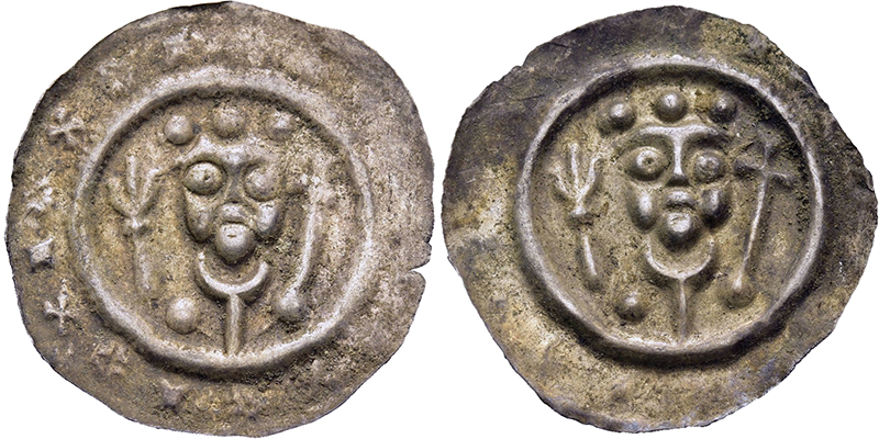 Römisch-Deutsches Reich, BODENSEEGEBIET, ULM, KÖNIGLICHE MÜNZSTÄTTE Friedrich II. 1215-1250, Brakteat o.J. (1215/35). Gekrönter Kopf von vorne zwischen Lindenzweig und Turm. Cahn 186 (Lindau). Häberle -. Slg.Wüthrich 303. Kestner-Museum 2598. 1 Ex. mit dunkler Patina. Min. Schrötlingsrisse am Rand. 2 St. fast St