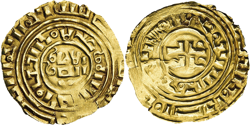 Ausland, KREUZFAHRERSTAATEN, KÖNIGREICH JERUSALEM Bezant o.J. (um 1187/1260; 3. Phase) Imitation eines fatimidischen Gold-Dinars des Kalifen Al-Amir. Beiderseits zwei Zeilen Schrift in zwei Schriftkreisen. Malloy 5. Leichte Prägeschwäche. Etwas dezentriert. 3,38 g. G O L D ss-vz