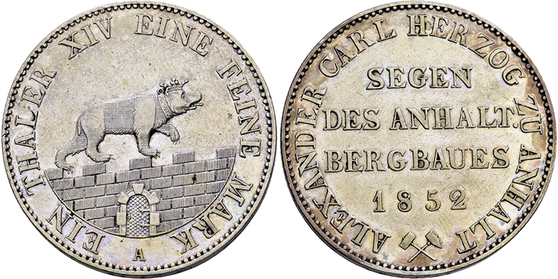 ANHALT-BERNBURG, HERZOGTUM Alexander Carl. 1834-1863, Berlin.Taler 1855 A Ausbringen der anhaltischen Gruben (vz). Dazu 1/6 Taler 1861 A (vz-St). AKS 16 u. 19. Jg. 66 u. 71. Dav. 504. Thun 3. Schöne Patina. 2 St.