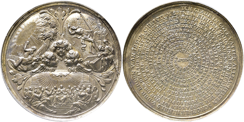 AUGSBURG, FREIE REICHSSTADT Medaille o.J. (um 1700; unsigniert, von Philipp Heinrich Müller) auf das christliche Glaubensbekenntnis. 3 Medaillons mit Sündenfall, Auferstehung und Ausgießung des Heiligen Geistes um 3 Engelsköpfe. Rs: Spiralförmig angeordnetes Glaubensbekenntnis um AMEN. Forst. 867. Slg.Erl. 2248. Slg.Goppel 2811. Schöne dunkle Patina. fast St
