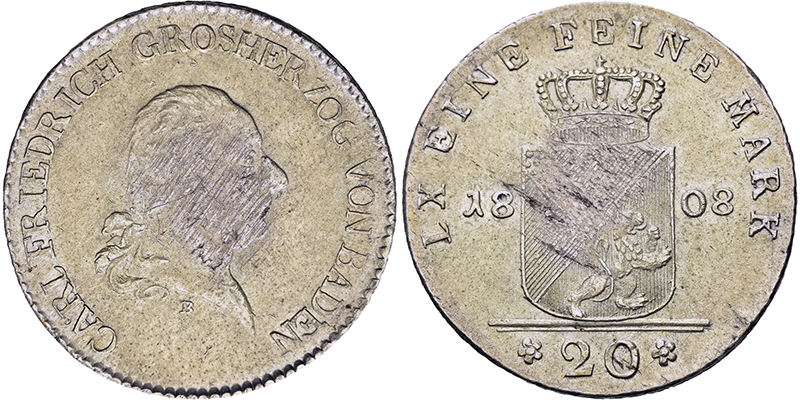 BADEN, GROSSHERZOGTUM Karl Friedrich. 1738-1803, Mannheim.20 Konventionskreuzer 1808 B (Stempel von Hans Heinrich Boltshauser). Stutzmann 52a. AKS 13. Jg. 11. Wiel. 778. Slg.Zeitz -. Dunkle Patina. Vs. leicht justiert, winzige Schrötlingsfehler. R ss-vz