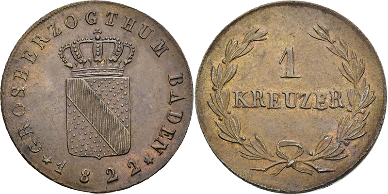 BADEN, GROSSHERZOGTUM Ludwig Wilhelm August. 1818-1830, Mannheim.1 Cu-Kreuzer 1822 (ohne Mmz.). Gekröntes Wappen. Rs: Wert in Lorbeerzweigen. AKS 65. Jg. 27. vz-St