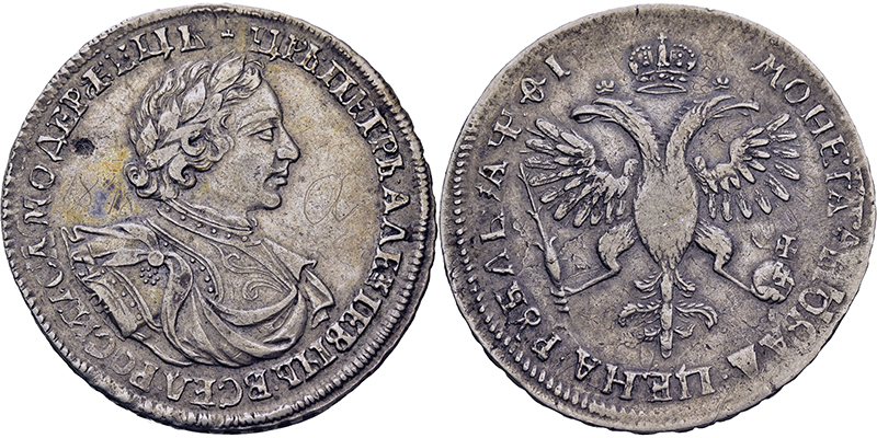 RUSSLAND Peter I. der Große. 1689-1725, Moskau.Rubel 1719 (kyrillische Jahrzahl; Mmz. Ottfried Konig). Geharnischtes Brustbild rechts mit an der rechten Schulter befestigtem Umhang. Rs: Gekrönter Doppeladler. Erhabene Randschrift. KM 157.3. Dav. 1653 A. Uzd. 0703. Dunkle Patina. Vs. Graffiti und Schrötlingsfehler. 27,17 g. R ss