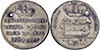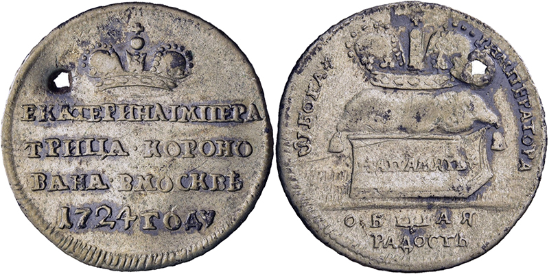 RUSSLAND Peter I. der Große. 1689-1725, Jeton 1724 (unsigniert) auf die Krönung seiner Gemahlin Katharina in Moskau. Krone über vier Zeilen Schrift. Rs: Krone auf Kissen und Podest. Diakov 60.10. Dunkle Tönung. Gelocht. 20,5 mm; 2,75 g. R ss-s