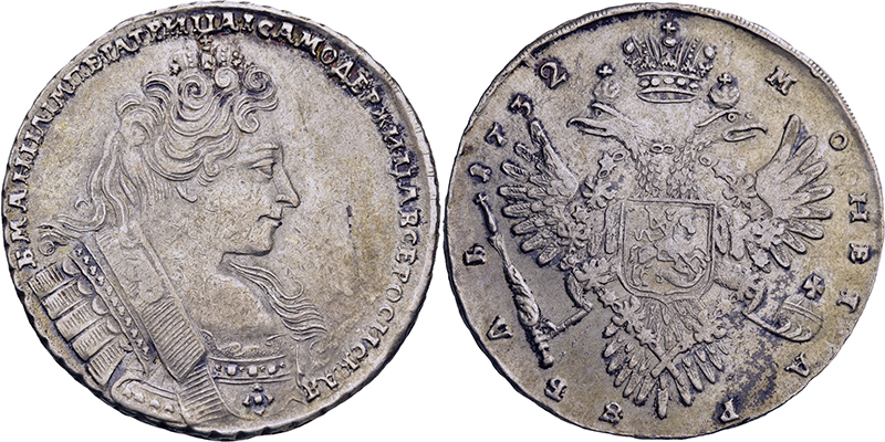 RUSSLAND Anna Iwanowna. 1730-1740, Moskau.Rubel 1732 (ohne Mmz.). Gekröntes und antik geharnischtes Brustbild rechts; Variante mit Brosche. Rs: Gekrönter Doppeladler. Fischgrätrand. KM 192.1. Dav. 1670. Uzd. 0703. Hübsche Tönung. Winzige Kratzer. 25,59 g. R gutes ss