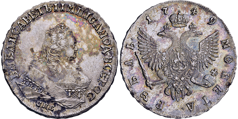 RUSSLAND Elisabeth Petrowna. 1741-1762, St. Petersburg.Rubel 1749 (ohne Mmz.). Gekröntes Brustbild rechts. Rs: Gekrönter Doppeladler. Erhabene Randschrift. KM 19b.4. Dav. 1677. Uzd. 0820. Herrliche Patina. Am Rand winziger Schrötlingsfehler. Min. Kr. 25,76 g. vz-St