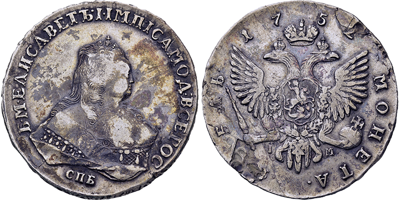 RUSSLAND Elisabeth Petrowna. 1741-1762, St. Petersburg.Rubel 1752 (Mmz. Ivan Markov). Gekröntes Brustbild rechts. Rs: Gekrönter Doppeladler. Erhabene Randschrift. KM 19b.5. Dav. 1677. Uzd. 0841. Dunkle Patina. Vs. Graffiti. Kleine Schrötlingsfehler. 25,57 g. ss