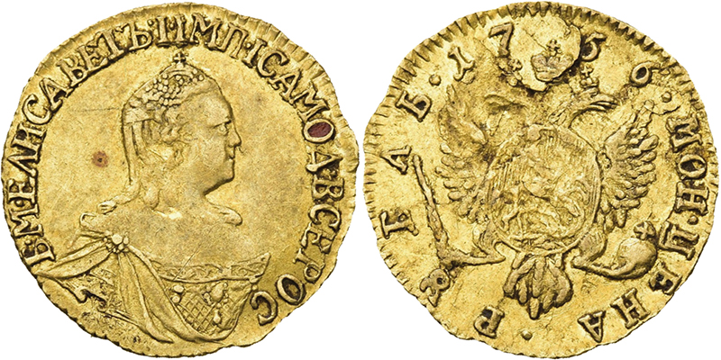 RUSSLAND Elisabeth Petrowna. 1741-1762, Moskau.Rubel 1756 (917 fein; ohne Mmz). Diademiertes Brustbild rechts. Rs: Gekrönter Doppeladler. Sev. 218. Fr. 116. KM 22. Rs. kleiner Schrötlingsfehler. 1,55 g. RG O L D ss