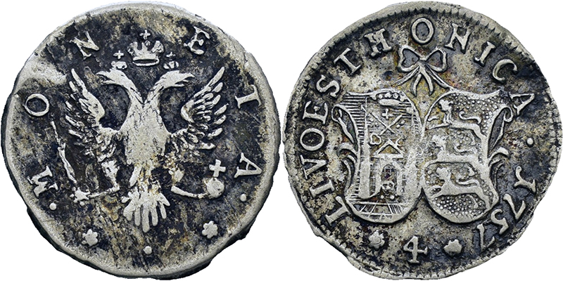 RUSSLAND Elisabeth Petrowna. 1741-1762, Moskau.4 Kopeken 1757 für Livland und Estland. Gekrönter Doppeladler. Rs: Doppelwappen von Livland und Estland. KM 2 (Livonia & Estonia). Dunkle Tönung. Leicht gebogen. 1,44 g. R ss