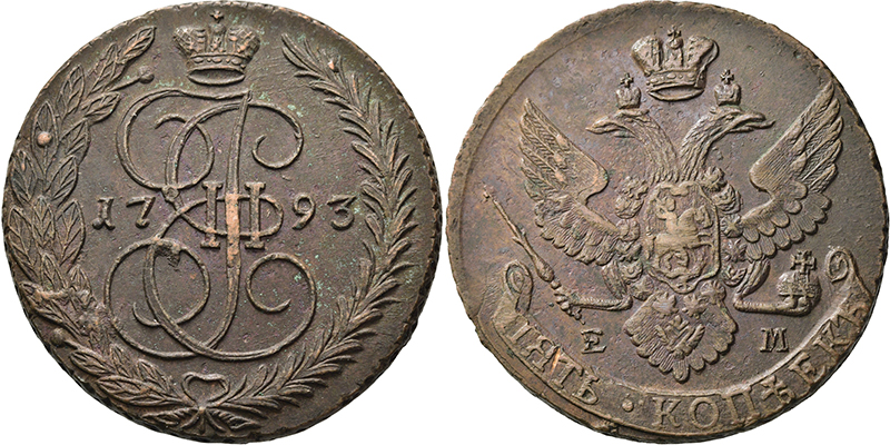RUSSLAND Elisabeth Petrowna. 1741-1762, 5 Kopeken 1760 und 1761. Dazu Katharina II. 5 Kopeken 1766 EM, 1769 EM, 1771 EM (leicht dez.), 1776 EM, 1778 EM, 1779 EM, 1781 EM, 1782 EM, 1783 EM, 1786 EM, 1789 EM, 1790 EM, 1792 EM, 1793 EM, 1794 EM; 1/4 Kopeke 1789 EM; sowie 3 Kopeken 1876; 2 Kopeken 1798 EM, 1812 EM und Izhora, 1841; Kopeke 1800; Denga 1735 und für Finnland. 10 Penniä 1866 und 5 Penniä 1867. 27 St. ge,s,ss