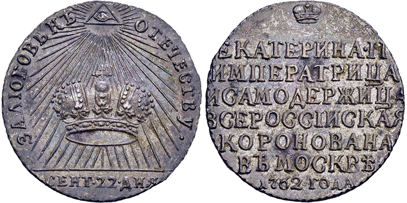 RUSSLAND Katharina II. die Große. 1762-1796, Jeton 1762 (unsigniert) auf ihre Krönung. Auge Gottes über Krone. Rs: Krone über sieben Zeilen Schrift. Diakov 117.8. Herrliche Patina. 20,0 mm; 2,60 g. R fast St