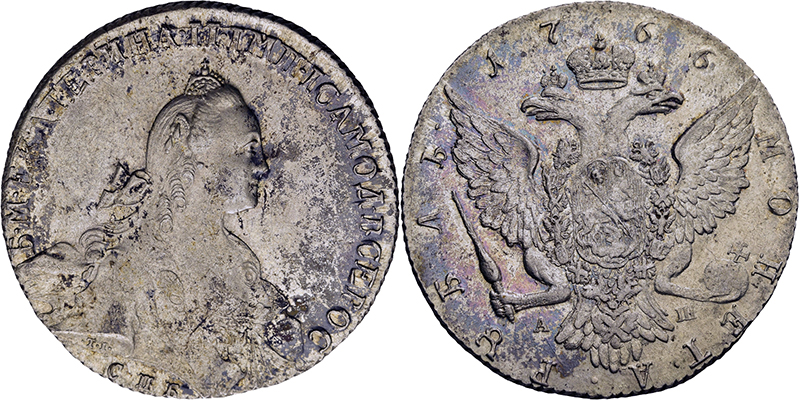 RUSSLAND Katharina II. die Große. 1762-1796, St. Petersburg.Rubel 1766 (Mmz. Alexei Schneze). Gekröntes Brustbild rechts, im Armabschnitt Signatur . T . I . Rs: Gekrönter Doppeladler. KM 67a.2. Dav. 1684. Uzd. 0980. Schöne Patina. Minimale Kratzer. 25,05 g. vz-St