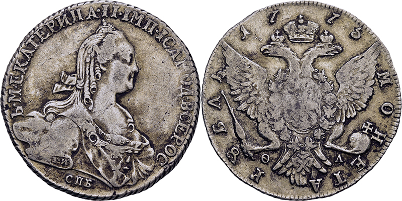 RUSSLAND Katharina II. die Große. 1762-1796, St. Petersburg.Rubel 1775 (Mmz. Fedor Lesnikov). Gekröntes Brustbild rechts. Rs: Gekrönter Doppeladler. KM 67a.2. Uzd. 1064. Hübsche dunkle Patina. 22,87 g. ss