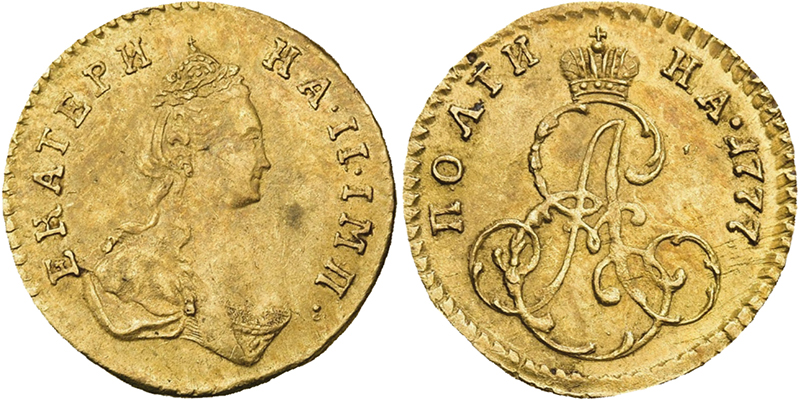 RUSSLAND Katharina II. die Große. 1762-1796, St. Petersburg.Poltina (1/2 Rubel) Gold 1777 (917 fein; ohne Mmz). Diademierte Büste rechts. Rs: Gekröntes Monogramm. Sev. 312. Uzd. 4086. KM 75. Fr. 136. Minimale Kratzer. 0,56 g. RG O L D fast vz