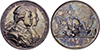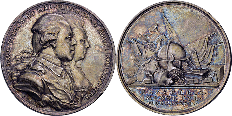 RUSSLAND Katharina II. die Große. 1762-1796, Medaille 1782 (Stempel von Theodore von Berckel) auf den Besuch des Kronprinzen Paul und seiner Gemahlin Maria Feodorowna in Brüssel. Brustbilder des Paares nebeneinander rechts. Rs: Attribute der Wissenschaft, der Schönen Künste und des Militärs. Diakov 191.1 (R3). Reichel 2953. Eb. 94. Schöne dunkle Patina. Winzige Kratzer. 40,2 mm; 27,90 g. R fast vz