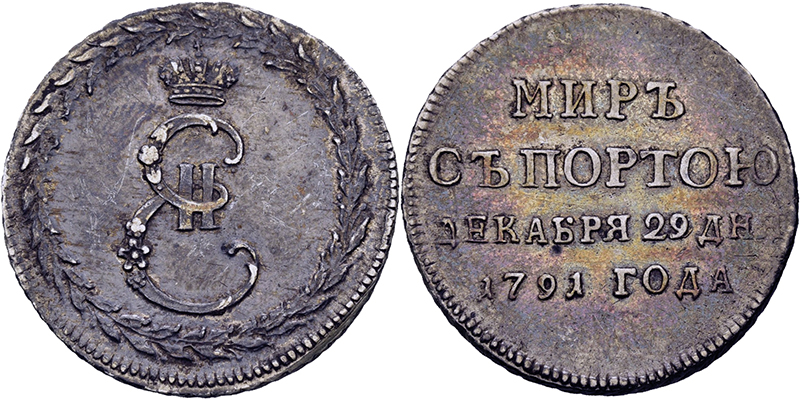 RUSSLAND Katharina II. die Große. 1762-1796, Jeton 1791 (unsigniert) auf den Friedenschluss mit dem Osmanischen Reich bei Jassy. Gekröntes Monogramm in Lorbeerkranz. Rs: Vier Zeilen Schrift. Diakov 225.9. Reichel 2839. Schöne dunkle Patina. Winzige Kratzer. 23,2 mm; 4,80 g. RR ss-vz