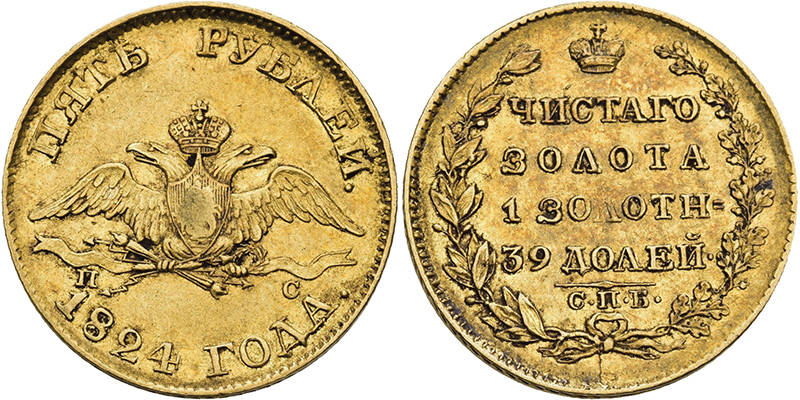 RUSSLAND Alexander I. 1801-1825, St. Petersburg.5 Rubel 1824 (Mmz. Paul Stupitzyn; 917 fein). Gekrönter Doppeladler auf Pfeilen. Rs: Krone über fünf Zeilen Schrift in Kranz. Sev. 393. Uzd. 0198. KM 132. Fr. 150. 6,58 g. RG O L D ss