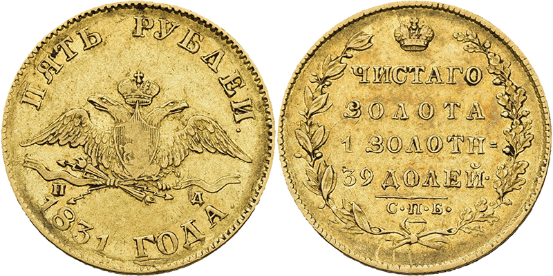 RUSSLAND Nikolaj I. 1825-1855, St. Petersburg.5 Rubel 1831 (Mmz. Pavel Danilov; 917 fein). Gekrönter Doppeladler auf Pfeilen. Rs: Krone über fünf Zeilen Schrift in Kranz. Sev. 408. Uzd. 0206. K. 262. Schl. 30. Fr. 154. Kleine Kratzer. 6,50 g. RG O L D fast ss