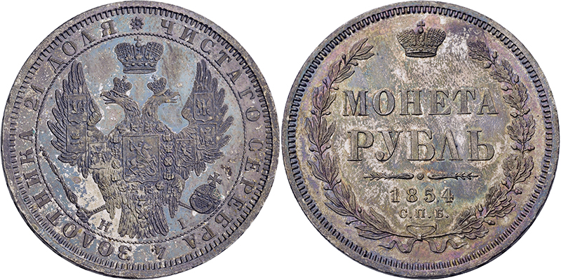 RUSSLAND Nikolaj I. 1825-1855, St. Petersburg.Rubel 1854 HI (Mmz. Nikolaj Iossa). Gekrönter Doppeladler. Rs: Krone über Wert in Kranz. KM 168.1. Uzd. 1711. Sev. 3625. Dav. 283. Herrliche dunkle Patina. Minimale Kratzer. 20,68 g. Erstabschlag