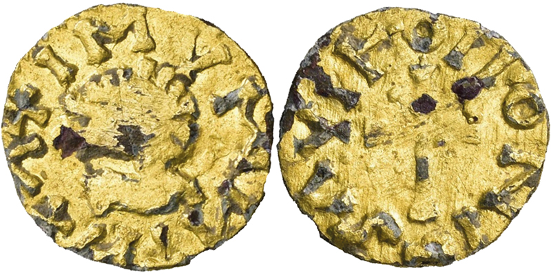 Merowinger Anonym., Triens o.J. (6./7. Jh.). + IMV (...) Büste in Schriftkreis links. Rs: Schrift um Kreuz. Grierson-Blackburn -. Prou -. Geringhaltige Legierung, leicht korrodiert. 0,74 g. RRRG O L D ss