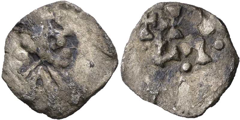 Merowinger Anonym., Denier o.J. (1. Hälfte 8. Jh.) in der Art des Patricius Nemfidus. Büste rechts. Rs: ++ / L . umgedrehtes L. Grierson-Blackburn -. Prou -. Dunkle Patina. Rs. leicht dezentriert. 0,65 g. RR ss