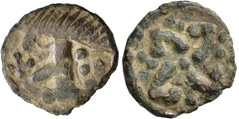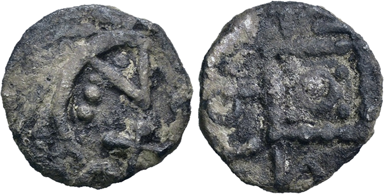 Merowinger Anonym., Frühe Angelsachsen, kontinentale Prägung (Friesland?).Sceatta o.J. (1. Hälfte 8. Jh.). \"Porcupine type\". Stilisierter Kopf rechts. Rs: Ringel und Punkte in den Winkeln eines Quadrates; außen Schrift. Grierson-Blackburn 662 ff vgl. Dunkle Patina. 0,82 g. RR ss