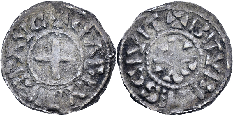 Karolinger Karl der Kahle. 843-877, Orléans.Denier o.J. + CRATIA DEI REX um Monogramm. Rs: + AVRELANIS CIVITAS um Kreuz. MG 948. Geringhaltige Legierung. 0,94 g. ss