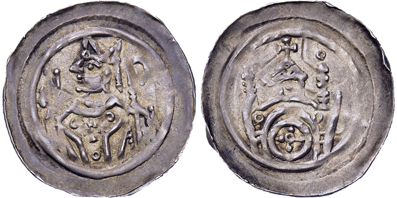 Römisch-Deutsches Reich, ELSASS, STRASSBURG, BISCHÖFLICHE MÜNZSTÄTTE Berthold von Teck. 1223-1244, Möglicherweise Molsheim.Pfennig o.J. Brustbild links mit Krummstab und segnender Rechter. Rs: Dreitürmige Kirche, im Portal Rad. Slg.Voltz 471. Nessel 103. 0,57 g. vz