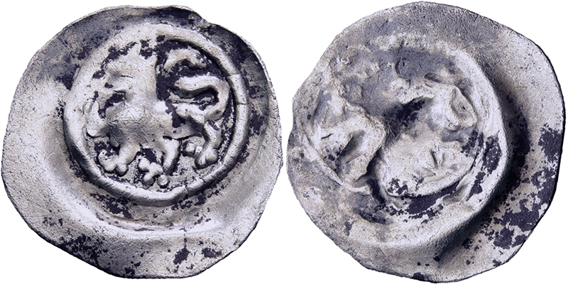 Römisch-Deutsches Reich, ELSASS, STRASSBURG, BISCHÖFLICHE MÜNZSTÄTTE Konrad III. von Lichtenberg. 1273-1299, Möglicherweise Kestenholz.Einseitiger Pfennig o.J. Löwe schreitet links. Rs. keine Prägespuren. Slg.Voltz 481 vgl. Nessel 146 ff. vgl. 0,36 g. fast ss