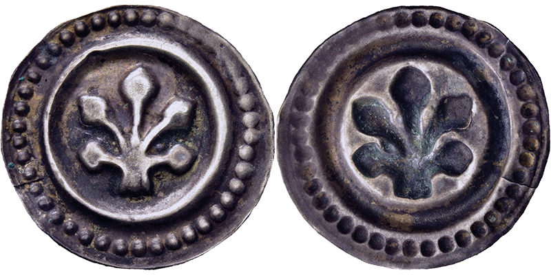 Römisch-Deutsches Reich, BODENSEEGEBIET, LINDAU, KÖNIGLICHE MÜNZSTÄTTE Anonym., Brakteat o.J. (um 1260). Linde mit fünf Blättern; außen Perlkreis. Rutishauser 227. Schöne dunkle Patina. 0,42 g. ss-vz