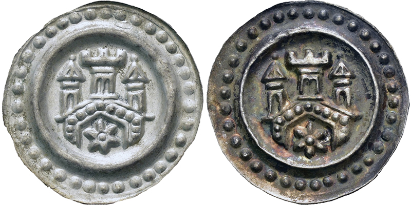 Römisch-Deutsches Reich, BODENSEEGEBIET, RAVENSBURG, KÖNIGLICHE MÜNZSTÄTTE Anonym. 1268-1300, Brakteat o.J. (um 1276). Dreitürmige Torburg, im Tor Stern. Cahn 208. Lanz 36. Rutishauser 413. Kestner-Museum 2551. 1 Ex. mit dunkler Patina. 2 St. fast St
