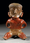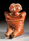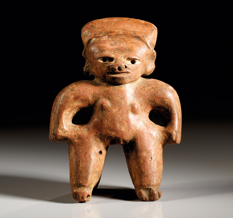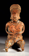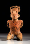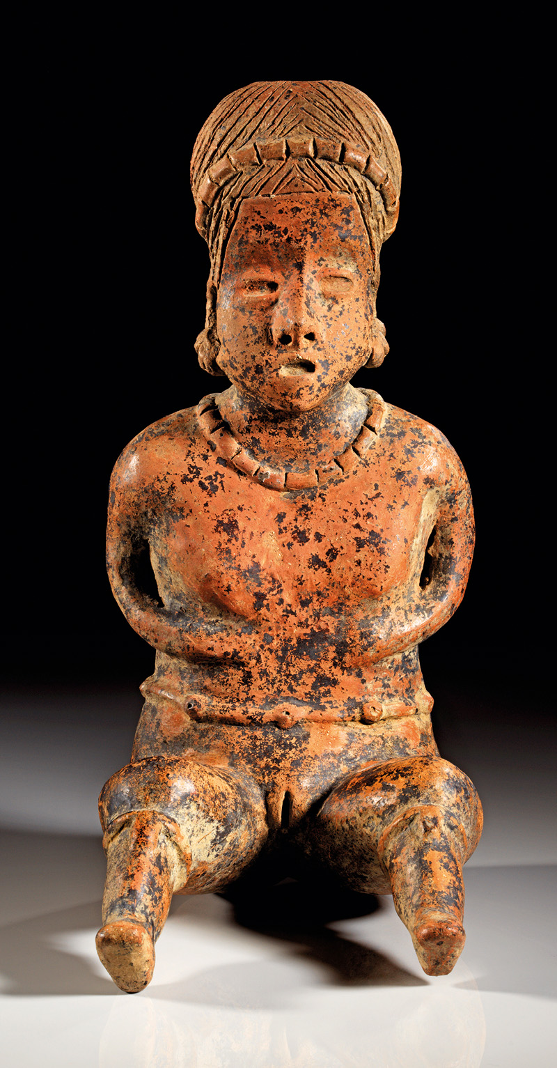 MEXIKO, Nayarit Westmexiko. Ca. 200 v. Chr. - 300 n. Chr. Sitzende Hohlfigur mit Schmuck an Nase und Armen sowie einem geflochtenem Kopfputz. Rötlicher Ton mit rötlich-oranger Bemalung. H. 22,2 cm. Leicht bestoßen.