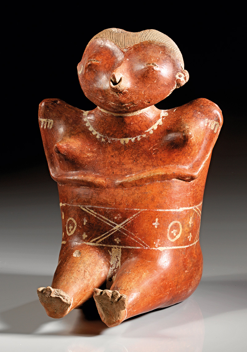 MEXIKO, Nayarit Westmexiko. Ca. 200 v. Chr. - 300 n. Chr. Hohlfigur einer sitzenden Frau mit leicht angewinkelten Knien und vor den Bauch gelegten Händen. Sie trägt Ohrschmuck und Ketten um Hals, Hüfte und unterhalb des Knies. Rötlicher Ton mit dunkelroter Bemalung H. 29,1 cm. Intakt.