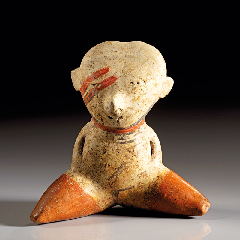 MEXIKO, Chinesco Westmexiko. Ca. 150 v. Chr. - 250 n. Chr. Sitzende Hohlfigur mit herzförmigem Kopf und gespreizten Beinen. Grauer Ton mit geometrischer Bemalung in rot, creme und schwarz. H. 17,2 cm. Oberfläche verfärbt, rechtes Ohr fehlt, sonst intakt.
