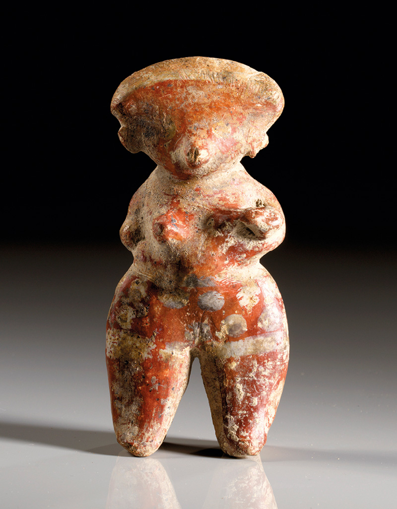 MEXIKO, Tlatilco Zentrales Hochland. Ca. 1500 - 550 v. Chr. Stehende weibliche Hohlfigur mit Ohrputz, Nasenschmuck und Löchern in den Augen, in denen sich wohl Einlagen befanden. Rötlicher Ton mit rotbrauner und Resten von weißer Bemalung. H. 18,6 cm. Linker Fuß bestoßen, sonst intakt.