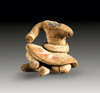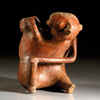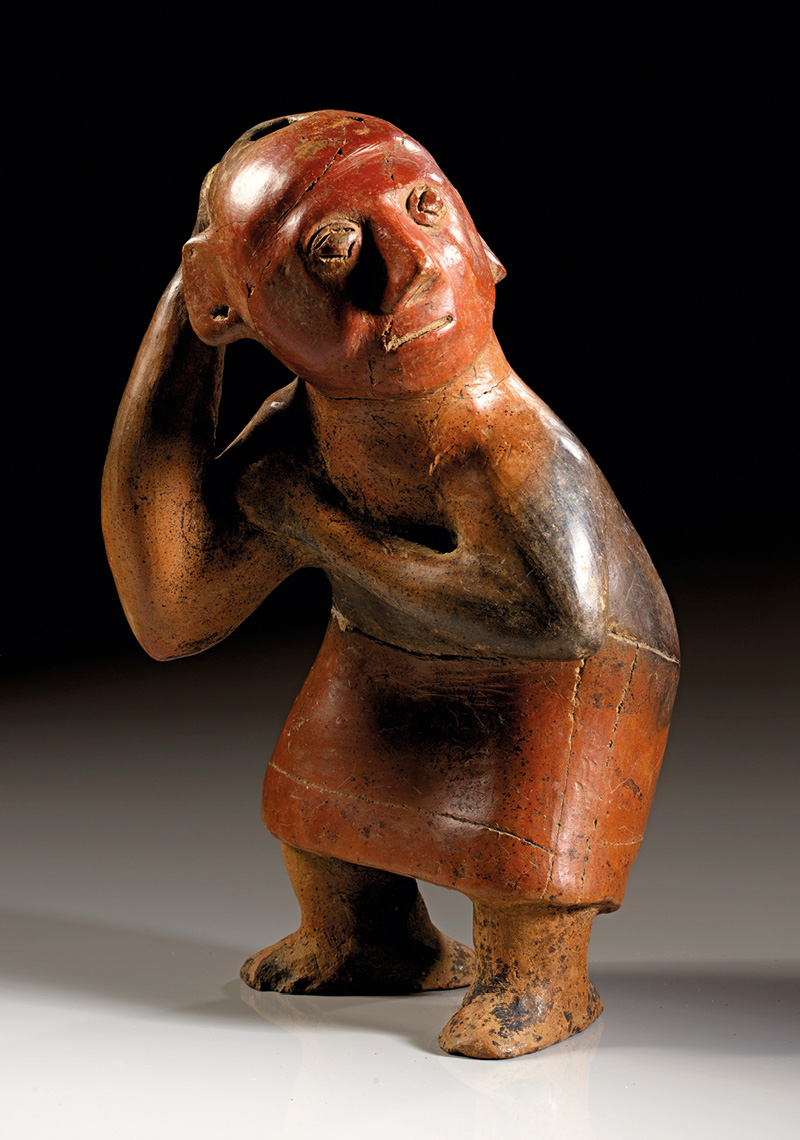 MEXIKO, Colima Westmexiko. Ca. 200 v. Chr. - 300 n. Chr. Hohlfigur eines nach vorne gebeugten, buckligen Mannes. Dieser hat den Kopf nach links gedreht und fasst mit der rechten Hand auf den Hinterkopf. Er ist mit einem Lendenschurz bekleidet, auf dem Rücken sind zwei deutlich hervortretende Wirbel dargestellt. Grauer Ton mit rotbrauner und grauer Bemalung. H. 27,4 cm. Restauriert mit kleinen Fehlstellen.