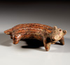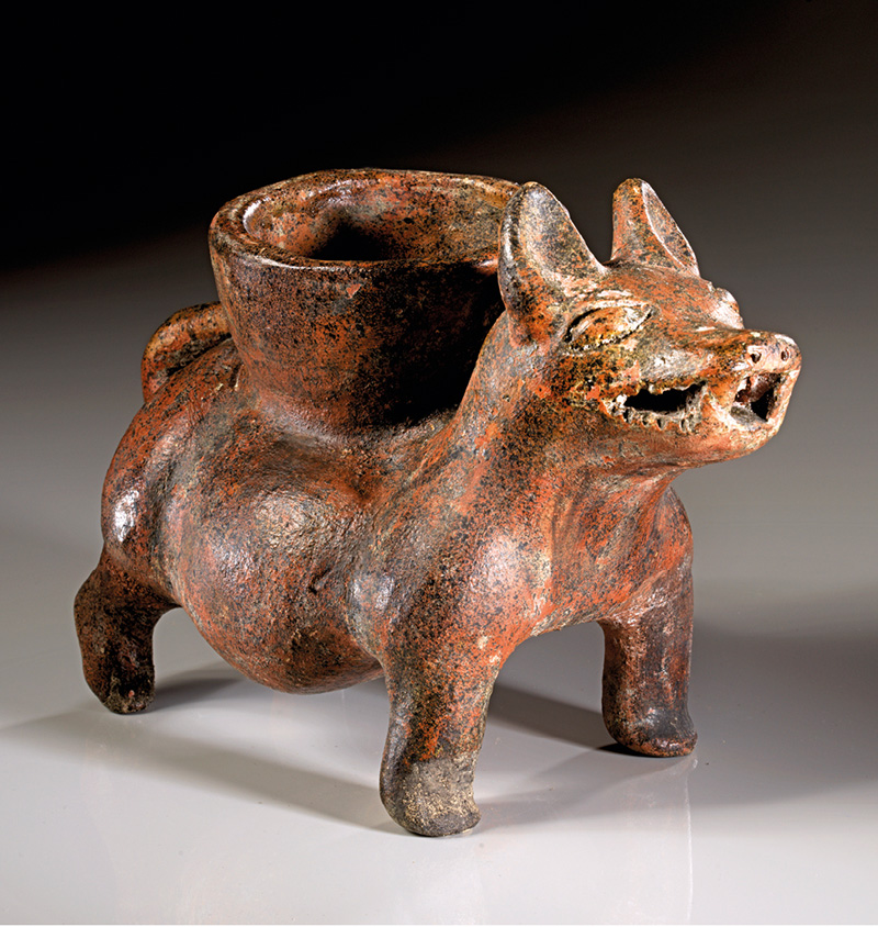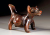 MEXIKO, Nayarit Westmexiko. Ca. 250 v. Chr. - 400 n. Chr. Hohlfigur eines stehenden Hundes mit leicht gebogenem Körper und geöffnetem Maul (diente vermutlich auch als Musikinstrument, Pfeiffunktion nicht mehr intakt). Rötlicher Ton mit Bemalung in creme, orange und rot. L. 16,5 cm. Kleine Fehlstellen an Schwanz und Beinen, sonst intakt.