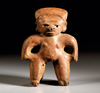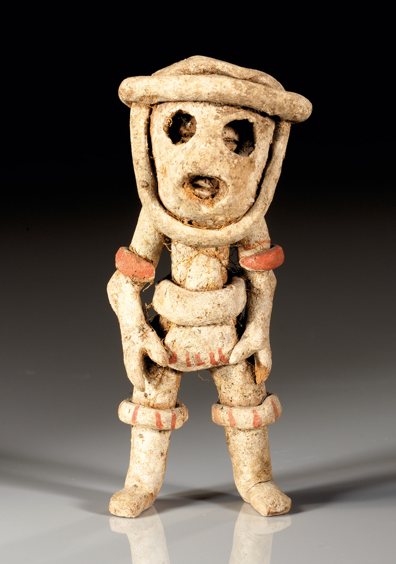 MEXIKO, Colima Westmexiko. Ca. 250 v. Chr. - 400 n. Chr. Figur eines stehenden Schamanen oder Kriegers mit Maske, um dessen Bauch ein Pektoral gebunden ist. Er trägt Reifen an Armen und Beinen. Rötlich-grauer Ton mit weißer und roter Bemalung. H. 9,1 cm. Winziger Teil der Finger fehlt, sonst intakt.