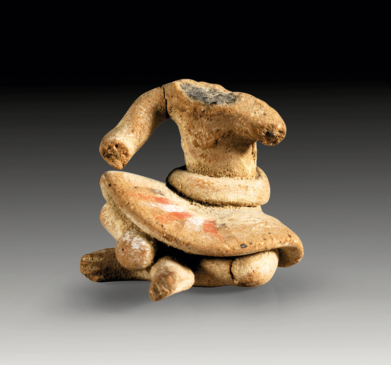 MEXIKO, Colima Westmexiko. Ca. 250 v. Chr. - 400 n. Chr. Körper einer menschlichen Figurine im Schneidersitz mit rockartiger Bekleidung. Rötlich-grauer Ton mit weißer und roter Bemalung. H. 2,1 cm. Kopf und Teile der Armen fehlen, Bruch am Bein geklebt.