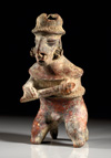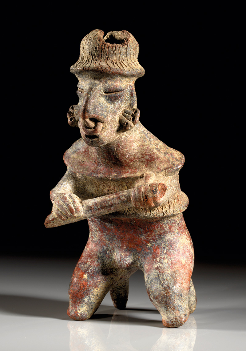 MEXIKO, Nayarit Westmexiko. Ca. 200 v. Chr. - 300 n. Chr. Hohlfigur eines Kriegers mit Körperpanzerung und einer länglichen Stabwaffe in beiden Händen. Er ist leicht nach vorne gebeugt und trägt Schmuck an Nase und Ohren sowie eine hutähnliche Kopfbedeckung. Rötlicher Ton mit Bemalung in dunkelrot, creme und grau. H. 21,4 cm. Teile der Kopfbedeckung und der Waffe fehlen, sonst nur oberflächliche Risse.