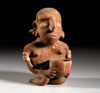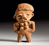 MEXIKO, Chinesco Westmexiko. Ca. 150 v. Chr. - 250 n. Chr. Massive Figur einer stehenden Frau mit einem Kind auf dem Arm. Rötlicher Ton mit dunkelroter und cremefarbener Bemalung. H. 13,1 cm. Kopf leicht bestoßen, sonst intakt.