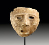 MEXIKO, Mezcala Westmexiko. Ca. 500 v. Chr. - 250 n. Chr. Gesichtsmaske aus hellem Stein mit geöffnetem Mund und ovalen Augen. In diesen finden sich Reste von dunkler Farbe, die auf Augeneinlagen hinweisen. H. 10,4 cm. Bestoßen mit kleinen Ausbrüchen an den Rändern. Mit Metallsockel.