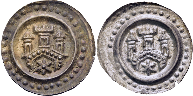 Römisch-Deutsches Reich, BODENSEEGEBIET, RAVENSBURG, KÖNIGLICHE MÜNZSTÄTTE Anonym. 1268-1300, Brakteat o.J. (um 1276). Dreitürmige Torburg, im Tor Stern. Cahn 208. Lanz 36. Rutishauser 413. Kestner-Museum 2551. 1 Ex. mit dunkler Patina. 2 St. fast St