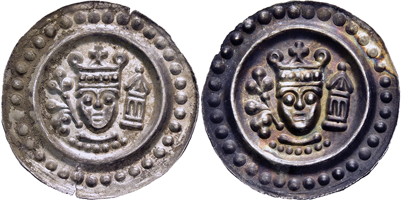 Römisch-Deutsches Reich, BODENSEEGEBIET, ULM, KÖNIGLICHE MÜNZSTÄTTE Friedrich II. 1215-1250, Brakteat o.J. (1215/35). Gekrönter Kopf von vorne zwischen Lindenzweig und Turm. Cahn 186 (Lindau). Häberle -. Slg.Wüthrich 303. Kestner-Museum 2598. 1 Ex. mit dunkler Patina. Min. Schrötlingsrisse am Rand. 2 St. fast St