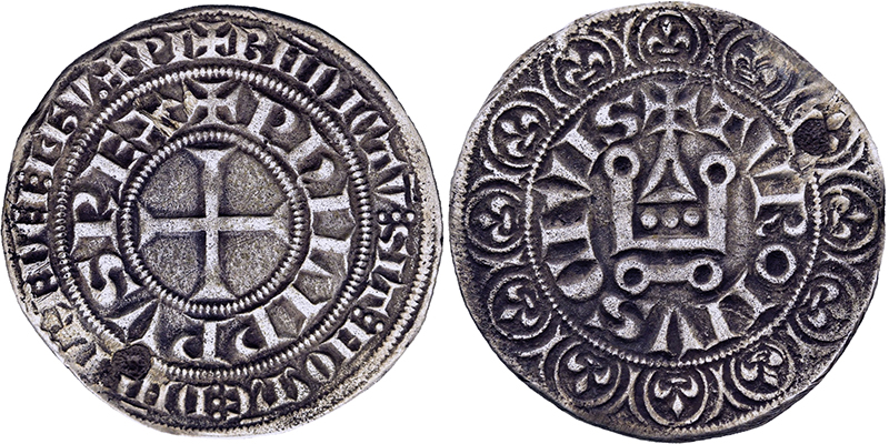 Ausland, FRANKREICH Philippe III le Hardi. 1270-1285, Gros tournois o.J. PhILIPPVS . REX + Kreuz in doppeltem Schriftkreis. Rs: TVRONVS. CIVIS Kastell von Tours. Laf. 204. Duplessy 202. Hübsche Patina. Min. korr. 2 St. R ss-s