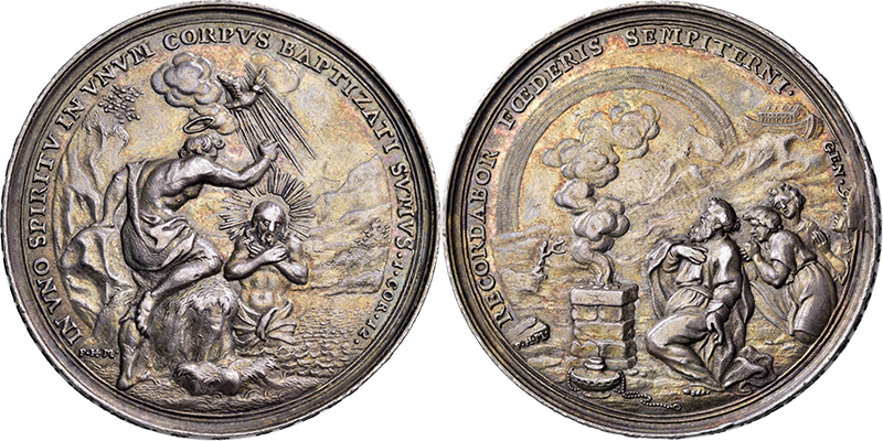 AUGSBURG, FREIE REICHSSTADT Taufmedaille o.J. (um 1700; Stempel von Philipp Heinrich Müller; Randschrift von Friedrich Kleinert). Geisttaube über Taufe Jesu im Jordan. Rs: Noahs Dankopfer, im Hintergrund Regenbogen und Arche auf Berg Ararat. Erhabene Randschrift. Forst. 874. Slg.Erl. -. Schöne dunkle Patina. Winzige Randfehler und Kratzer. 44,6 mm; 29,52 g. vz